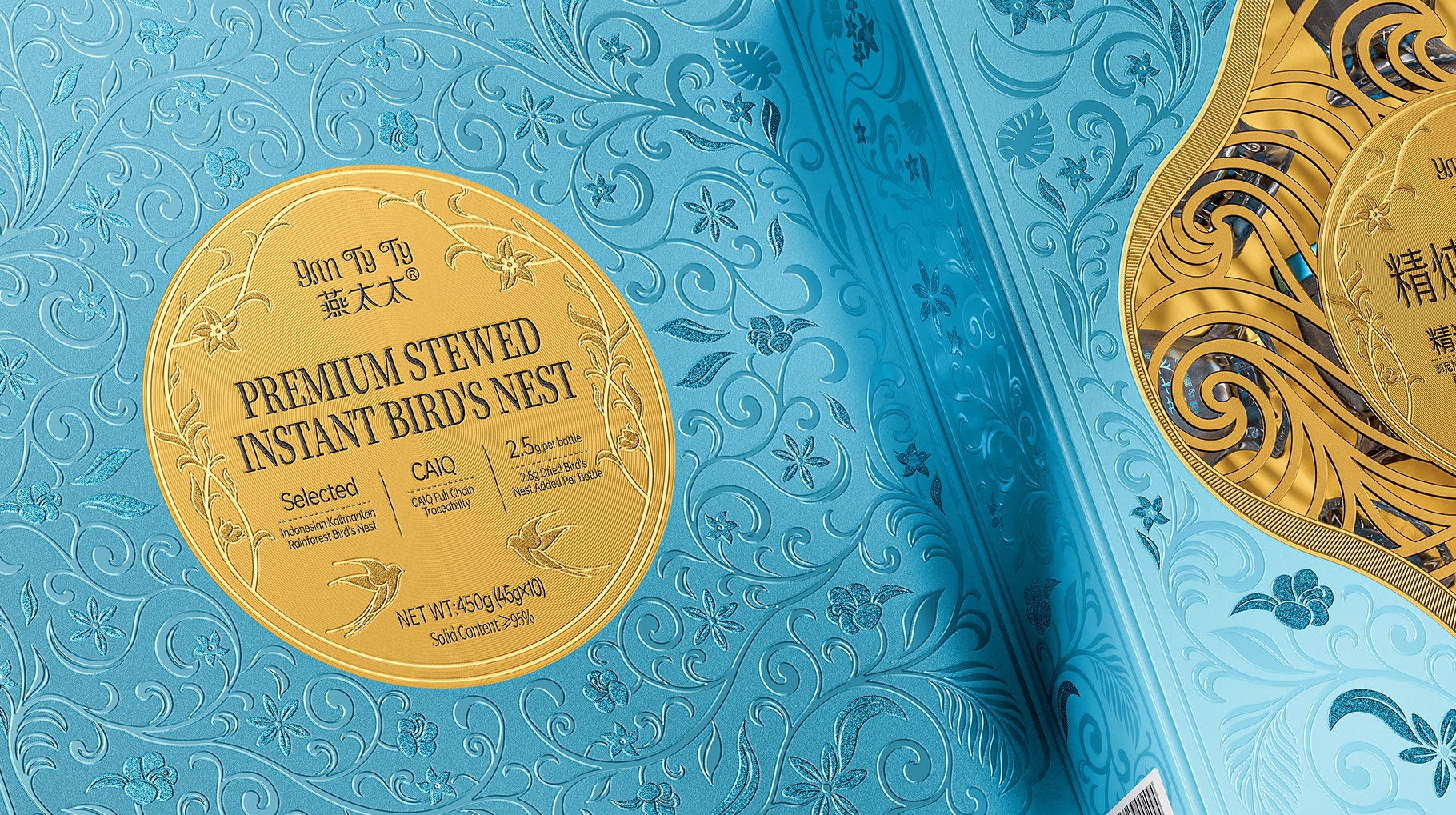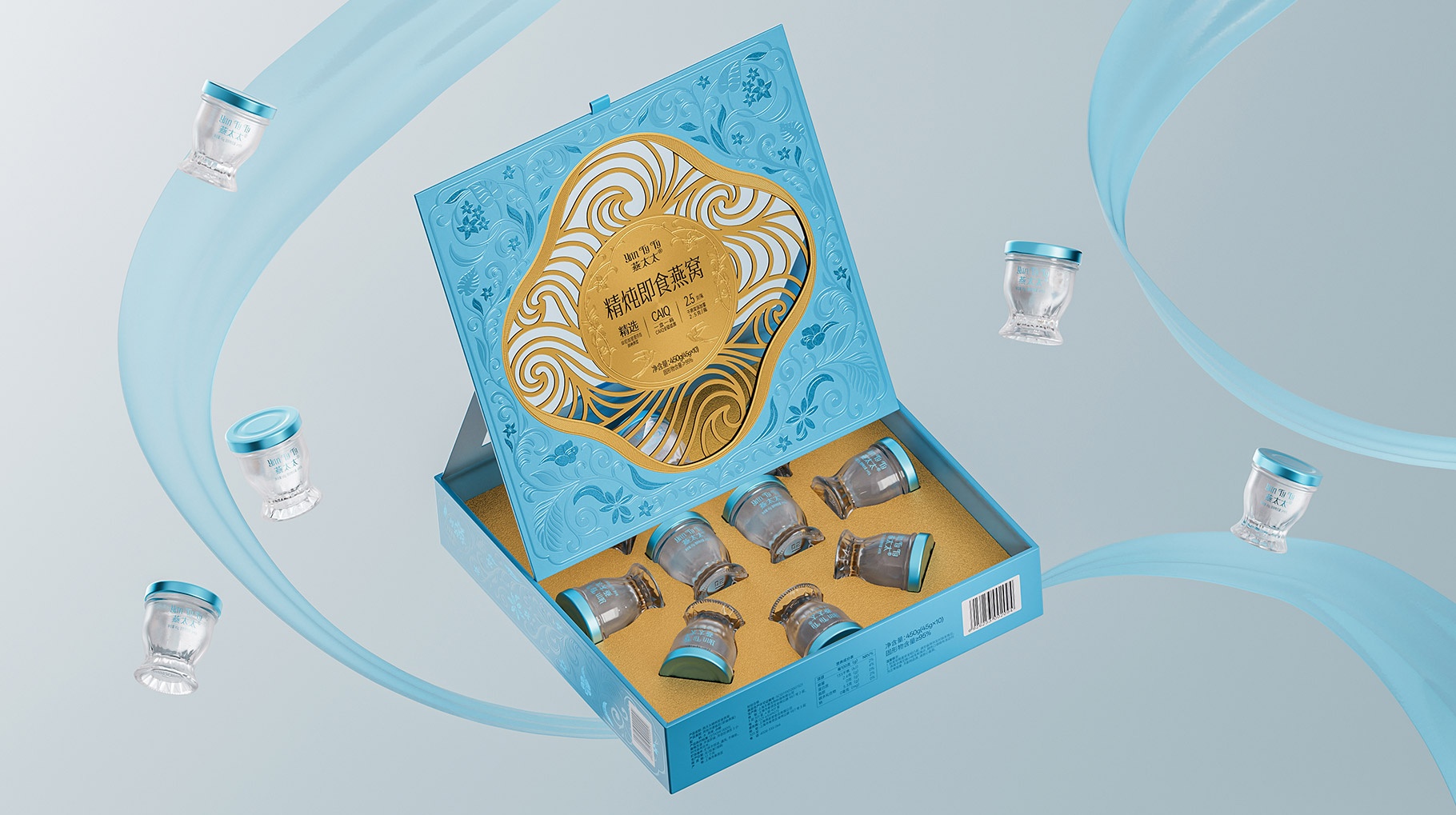 整體包裝創意以獨創三層視覺敘事:中部采用東方園林“框景”手法打造鏤空視窗,湖藍色藤蔓紋樣層疊延展,再現雨林生態的呼吸韻律,虛實交錯間透現燕窩瑩潤質感。