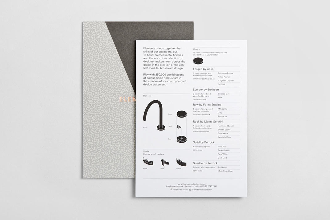 元素是最新的噴口和處理范圍從布魯克林的精品銅器業(yè)務(wù),水印收集。它有15個金屬飾面,3個手柄設(shè)計和19個手工制作的封面。這些構(gòu)成了可能的25萬種可能的組合。元素的模塊性、實質(zhì)性和多樣性被描繪出來,并通過英國設(shè)計工作室DN&co創(chuàng)建的視覺標(biāo)識來表達(dá),然后在一系列獨特的小冊子封面上播放。