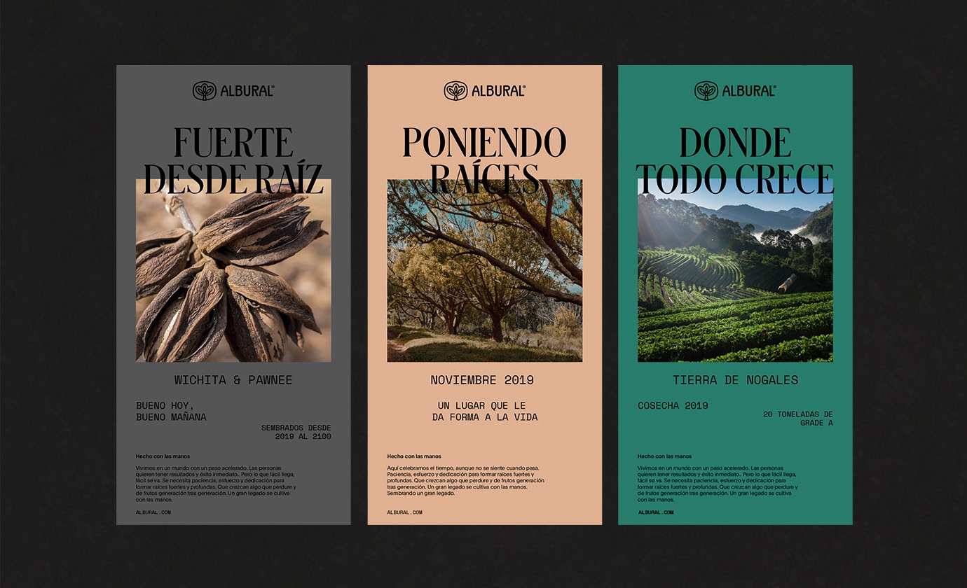 Albural是墨西哥建造的最大的山核桃果園之一。 Albural知道人生中最美好的事情需要時間。 果園是由一個擁有強大價值觀和更強職業(yè)道德的家庭從頭開始建造的。 作為其家族傳承的一部分,Albural旨在延續(xù)數(shù)代之久,因此我們必須創(chuàng)建一個可以承受的品牌。 家庭是標識中的核心概念,這就是為什么品牌標記既是果園中的家譜又是山核桃樹的象征。 我們根據(jù)山核桃殼的不同形狀創(chuàng)建了不同的圖案,這些形狀以“堆棧”的形式組裝在一起,使該品牌既輕巧又有趣。 結(jié)果是一個強大而永恒的品牌,擁有獨特的視覺系統(tǒng),傳達了一個強大家庭的故事,并將成為偉大遺產(chǎn)的開端。